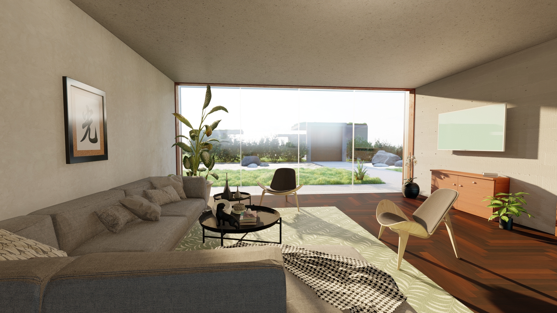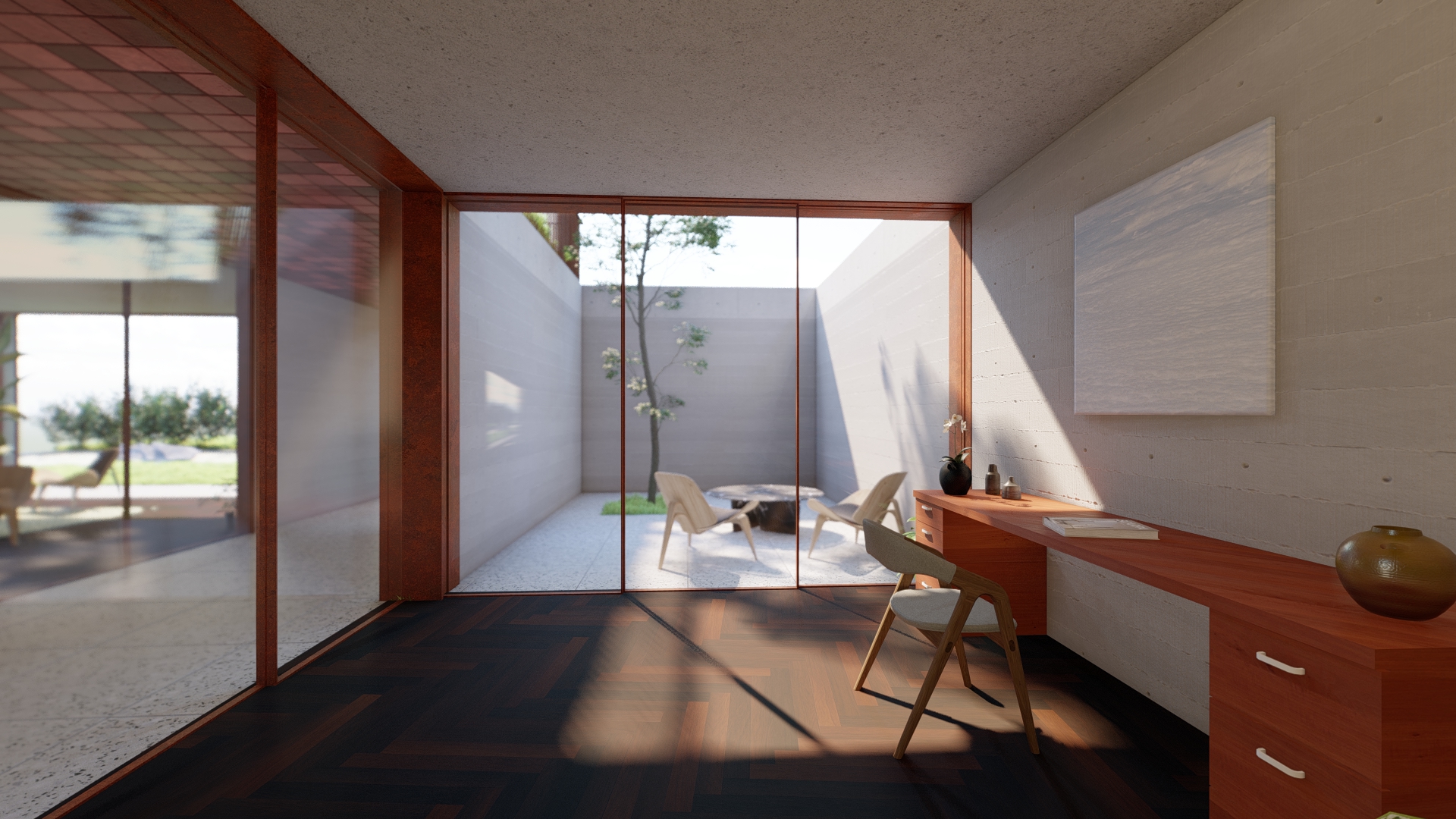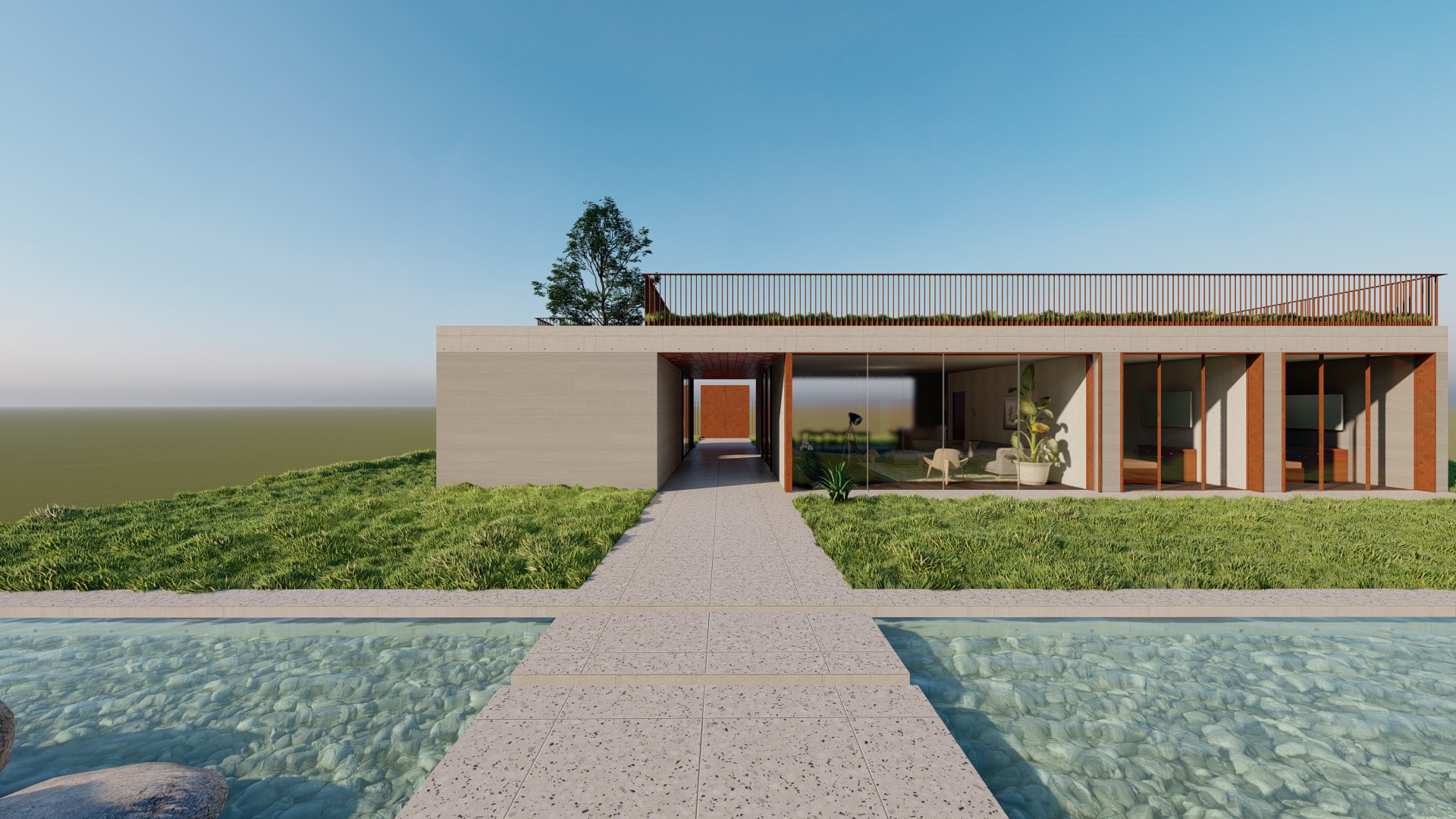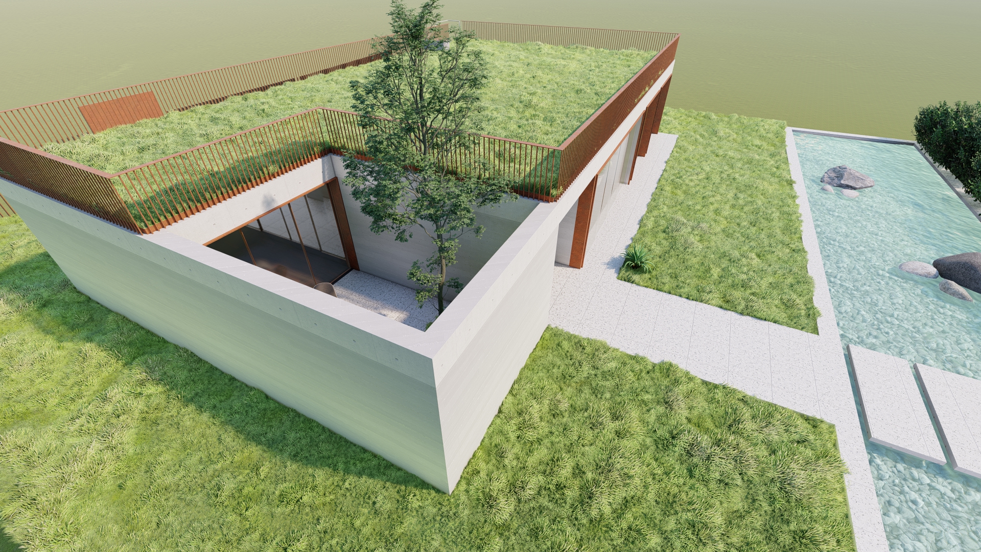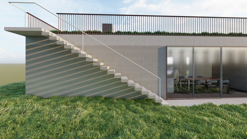 The ambassador’s residence is part of the complex of the Georgian Embassy in Portugal, separated from it by a gate and a water mirror. It uses a similar design and material choices as the embassy to signify their connection. It stands on the same level as the roof garden of the main building.