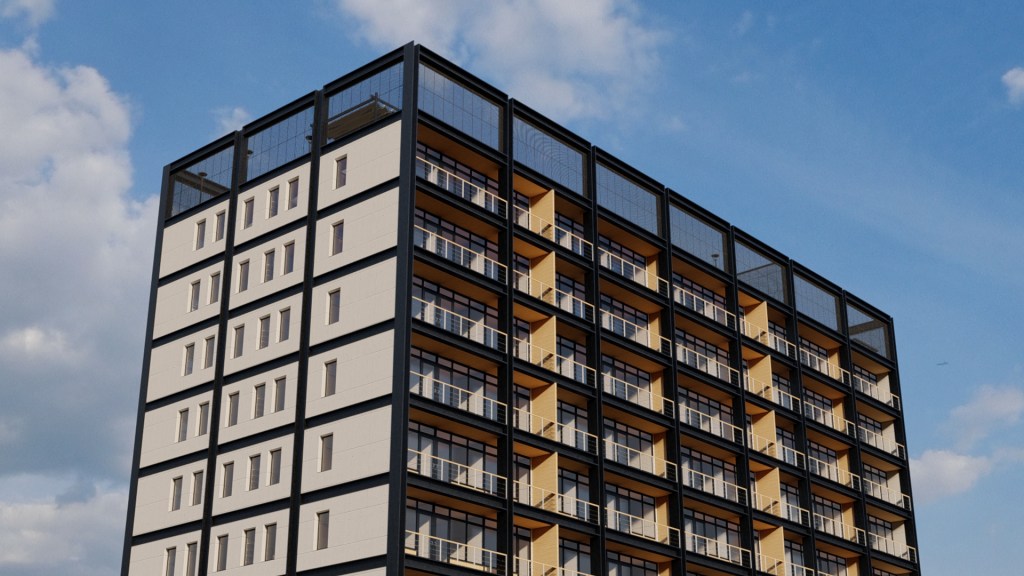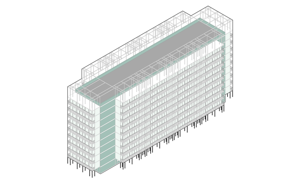 The apartment building is close to Tbilisi City Hall. The combined concrete and steel structure determines the exterior aesthetic and features a public green roof. It is meant to replace existing large apartment buildings that no longer fulfill their purpose effectively.