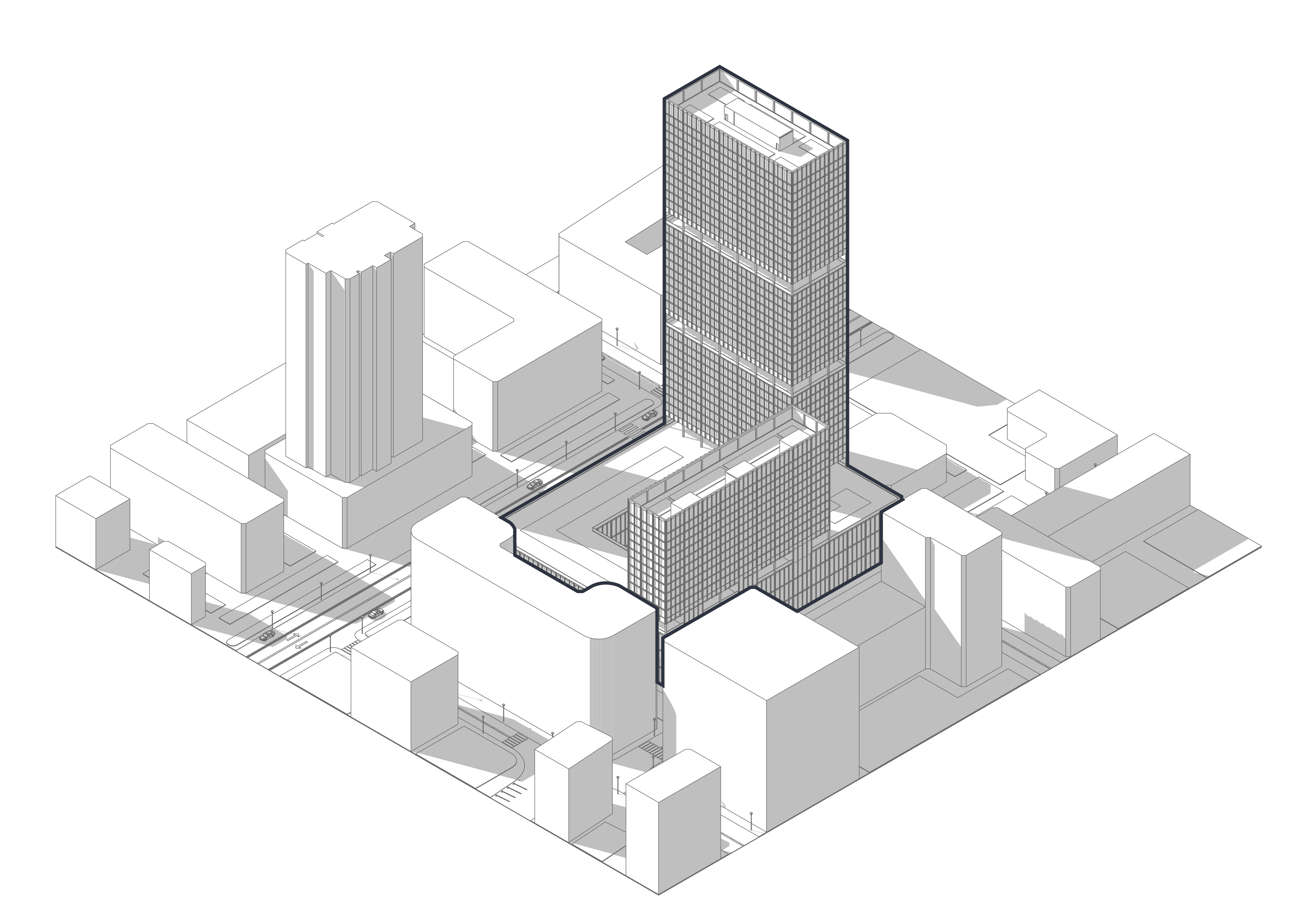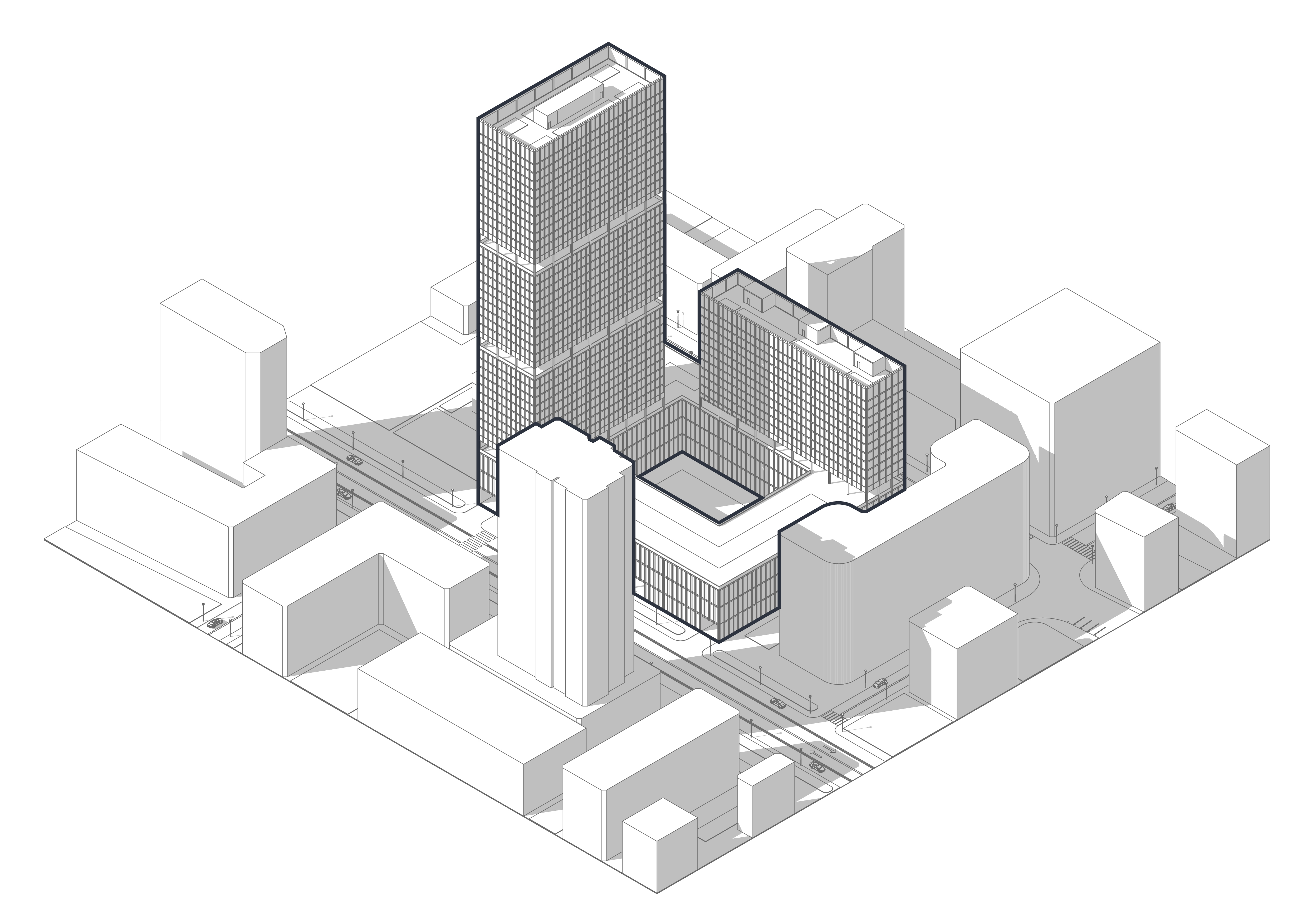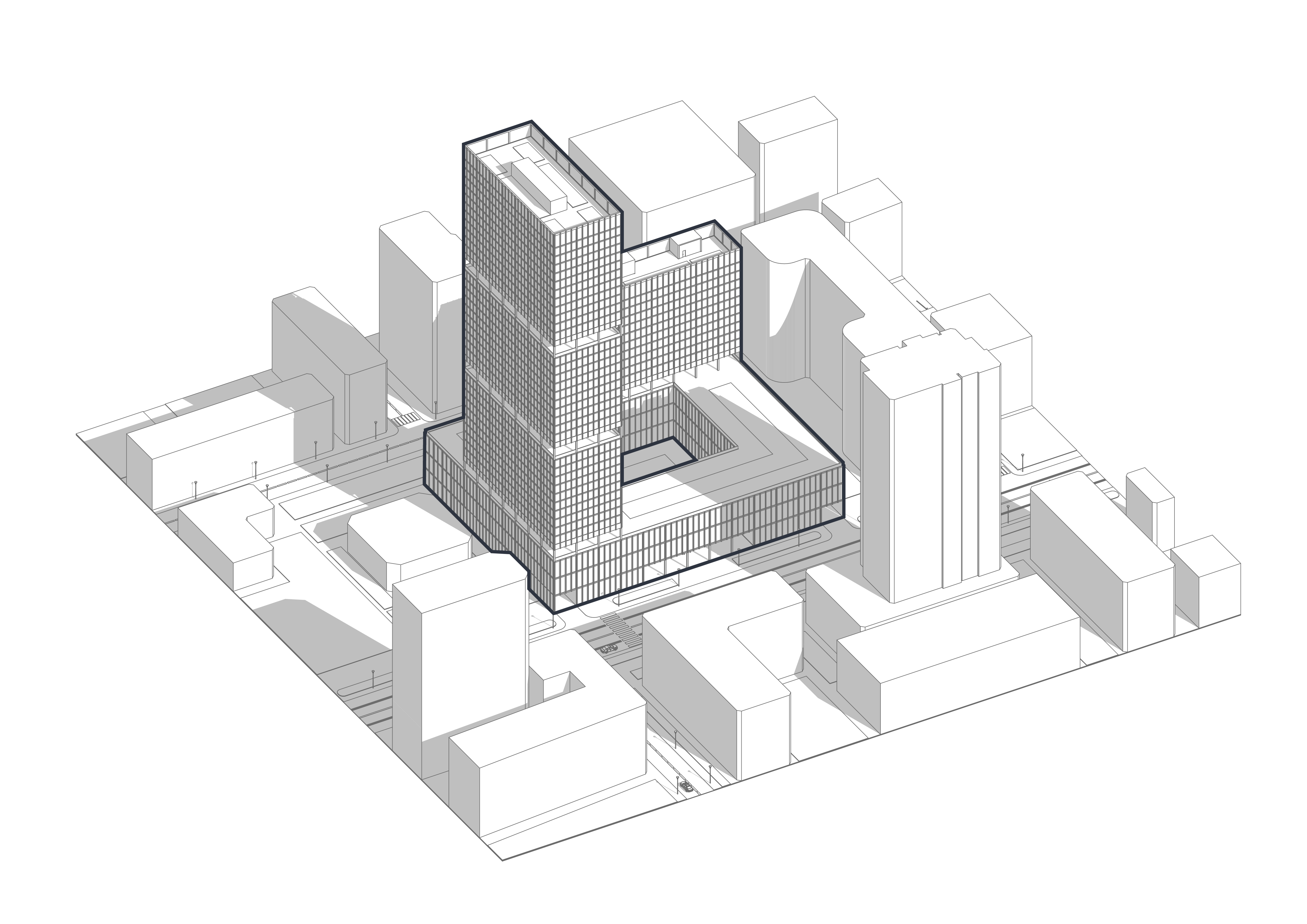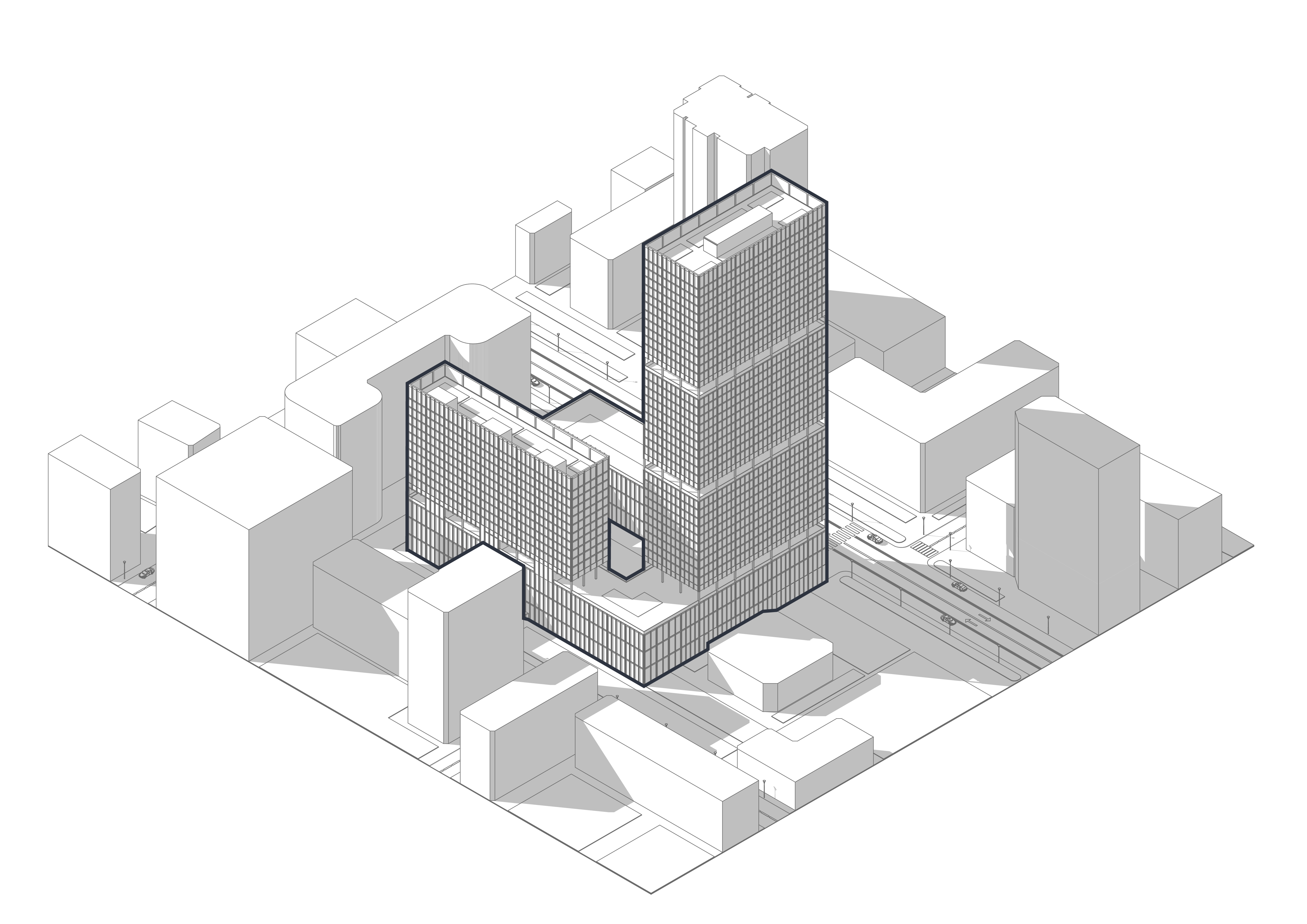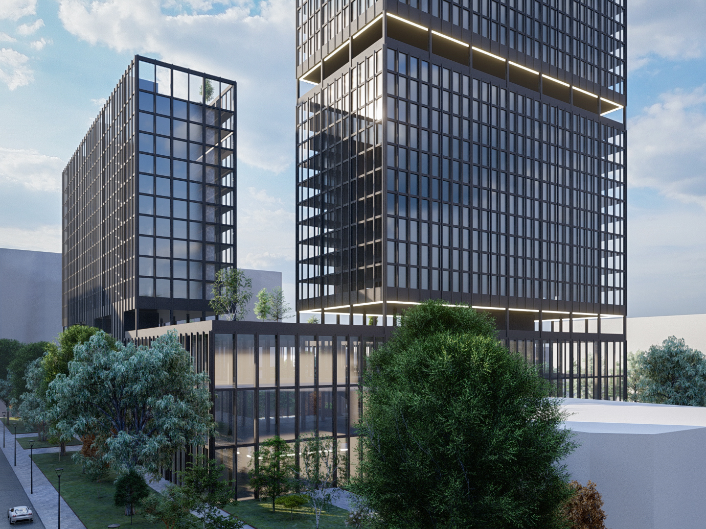 The skyscraper complex is located on Ilia Chavchavadze avenue, next to the Embassy of the Czech Republic in Tbilisi. The project includes commercial spaces, office spaces, a hotel, an apartment building, communal spaces for recreation, a central courtyard, two roof gardens, and four floors of underground parking.