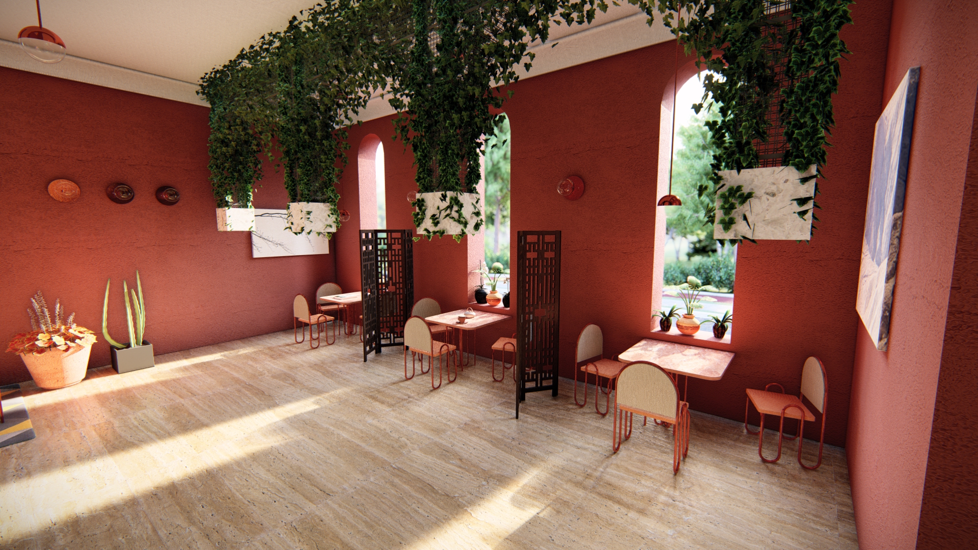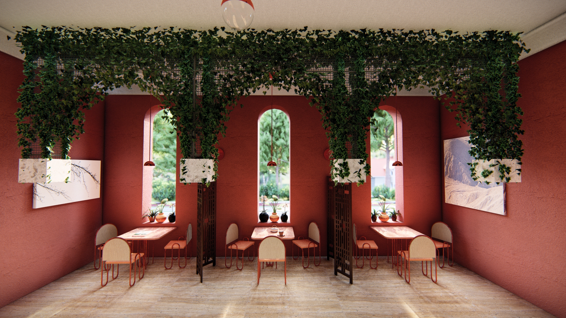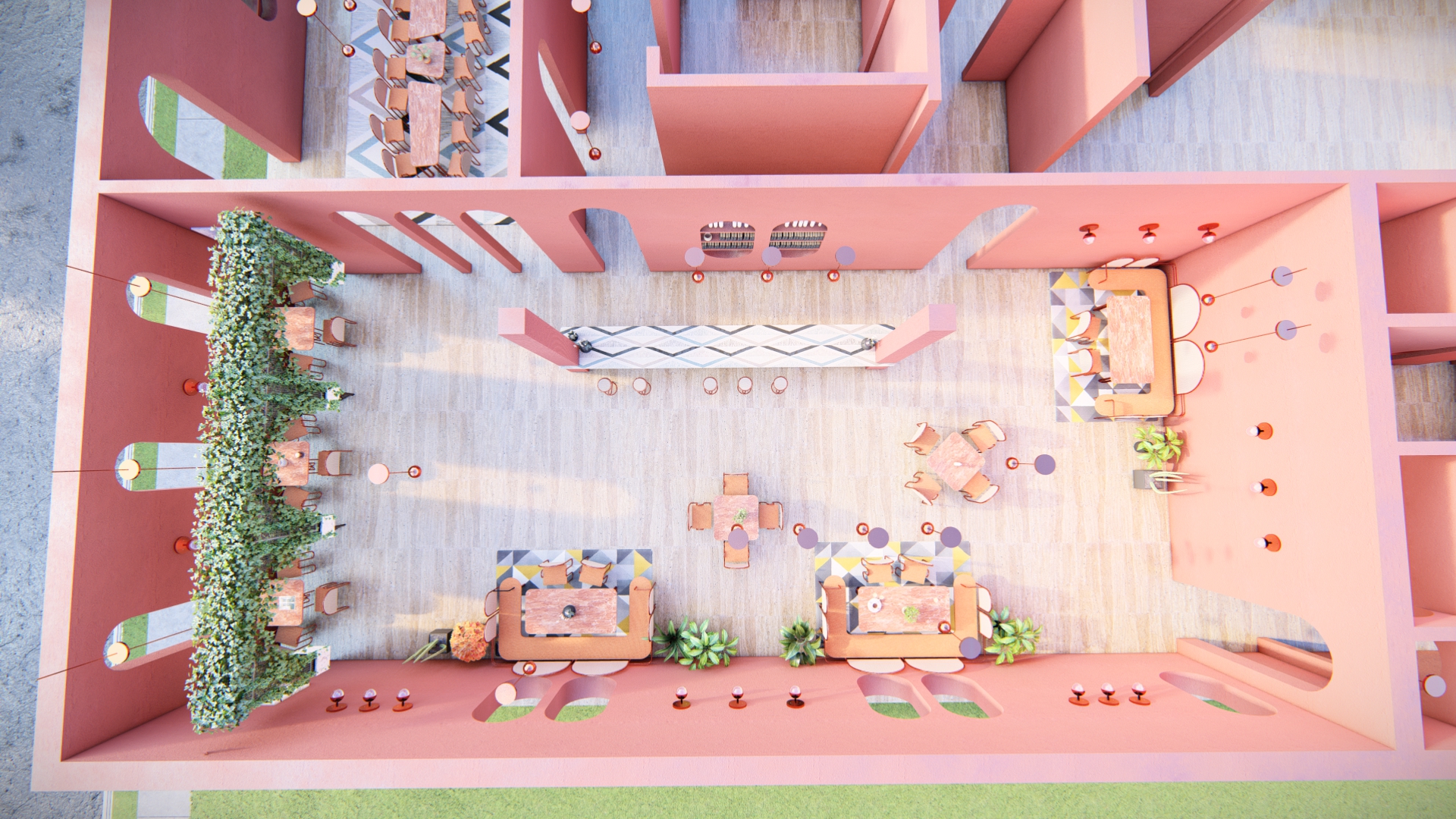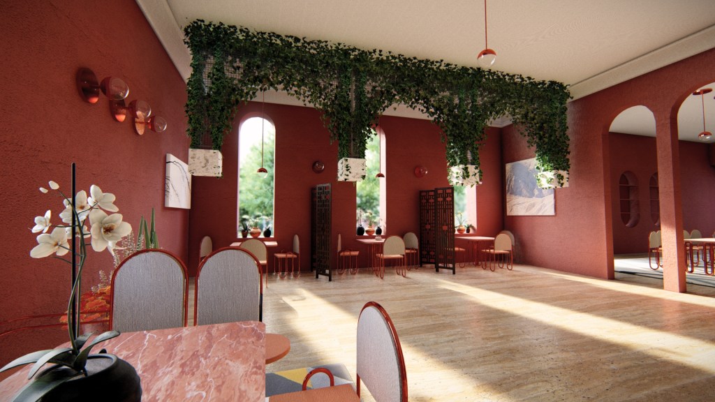 The design of the Café uses only custom-made chairs, sofas, tables, and lights. The products use copper, marble, and different types of fabrics. Forms and characteristics usually associated with theaters inspire the design.