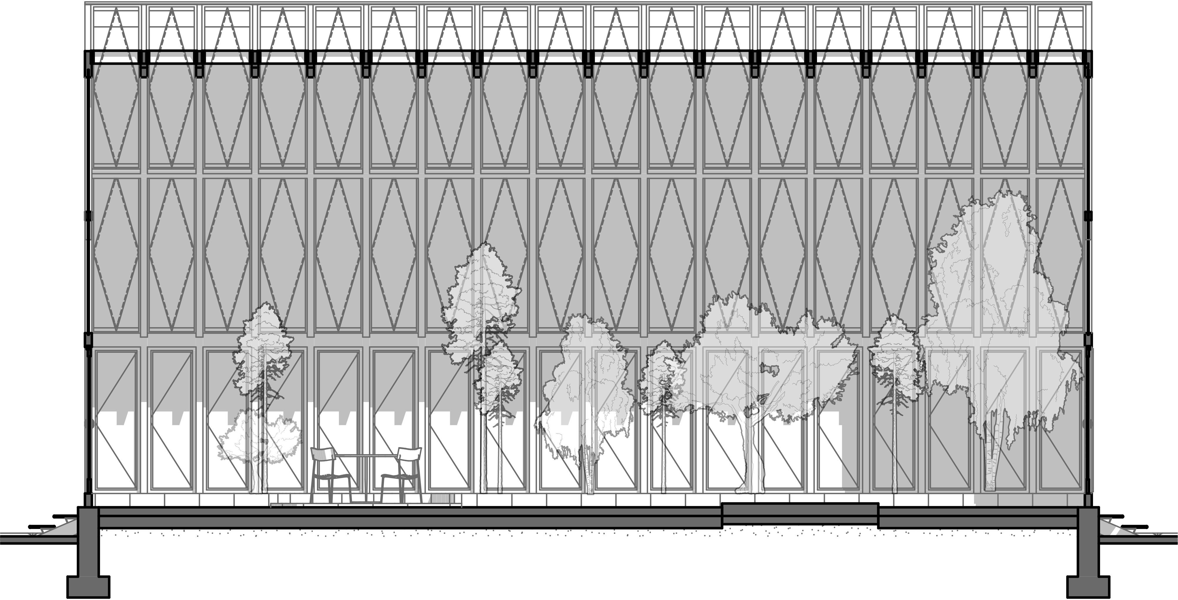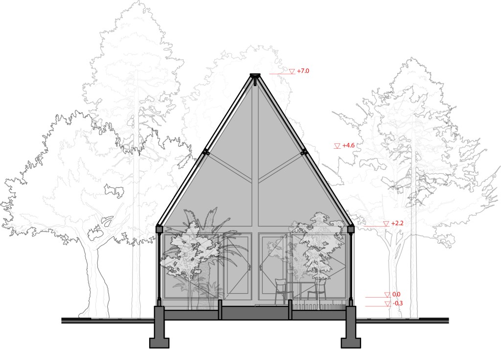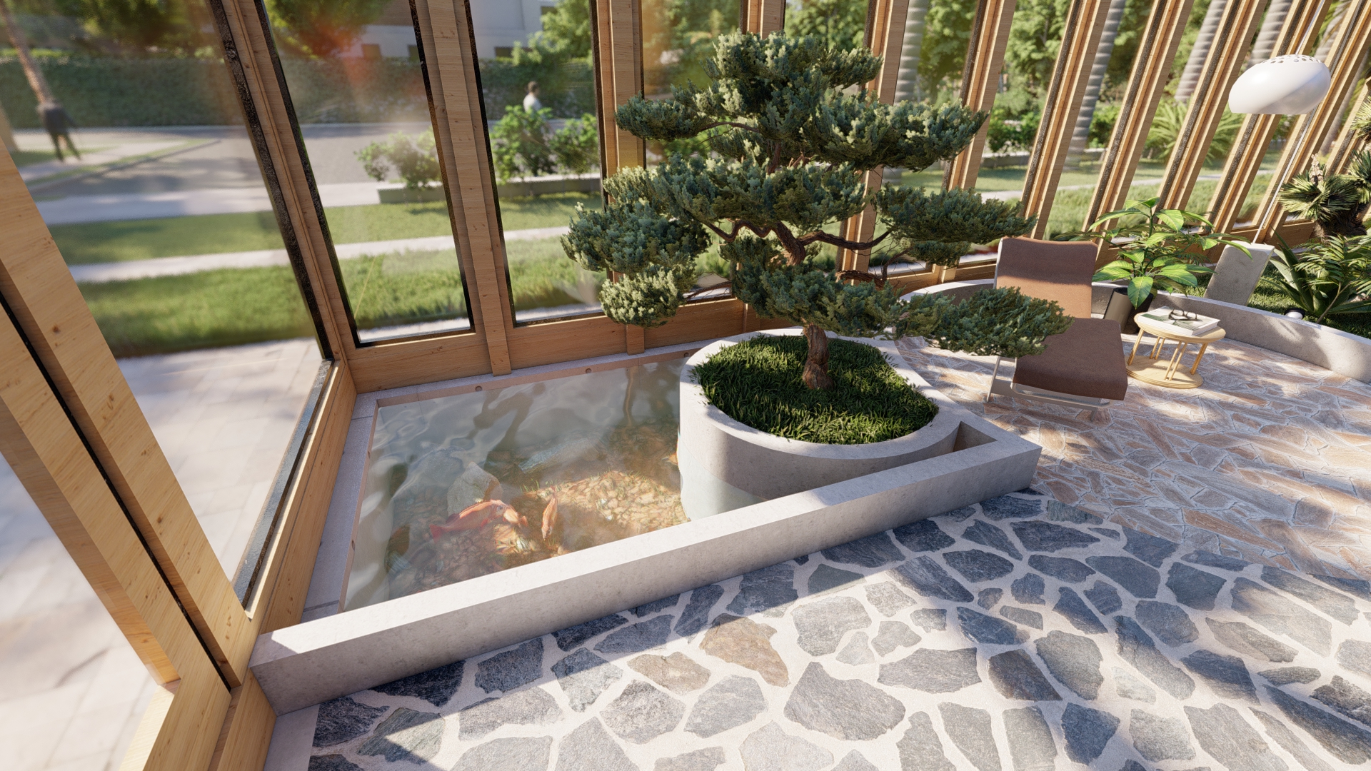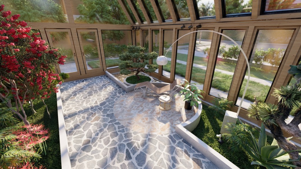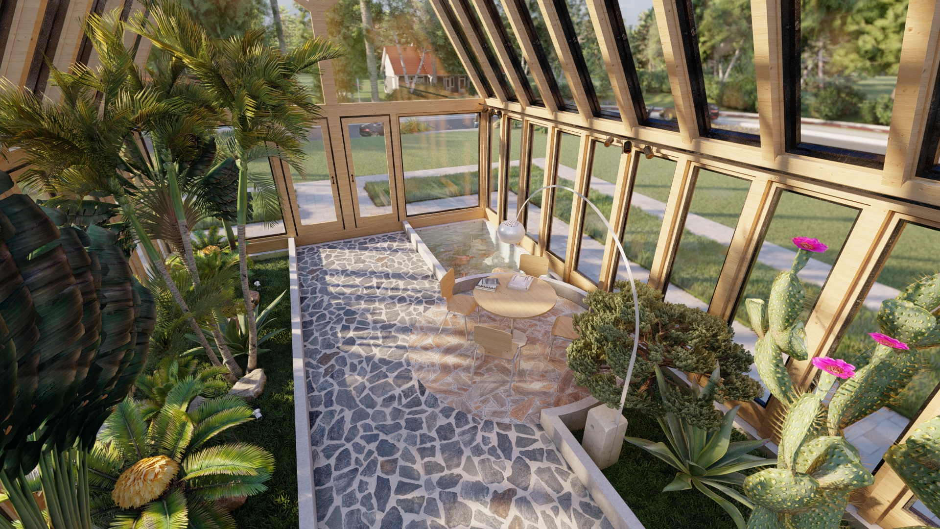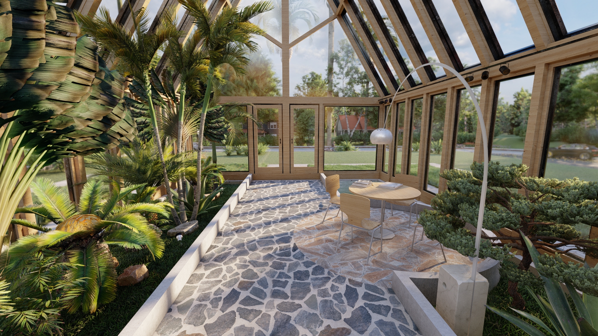 The winter greenhouse (plant conservatory) uses a wooden structure and a minimalist design. It has a pathway in the middle and two separate spaces for people. Like any greenhouse, it allows exotic and rare plants to flourish in naturally unfavorable environments.